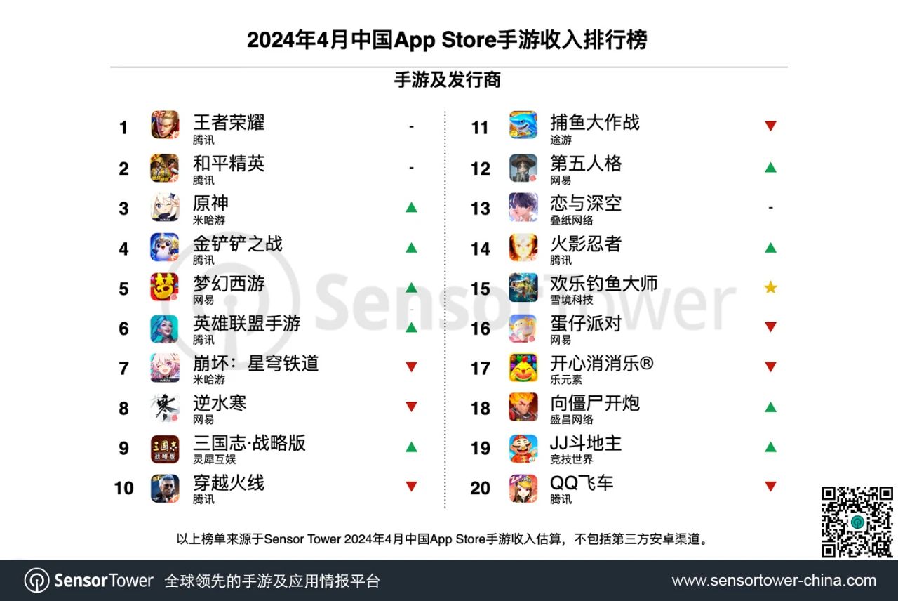凭仗抖音等途径的密布宣发,3D休闲模仿手游《欢喜垂钓大师》以沉溺式的体会和丰厚的内容在国内商场敏捷引爆垂钓热潮。4月该游戏以840万下载量,登顶我国iOS手游下载榜,一起位列国内iOS手游月活泼用户排行榜第4名,仅次于《王者荣耀》、《蛋仔派对》以及《平和精英》。得益于这款游戏的杰出体现,发行商雪境科技4月收入环比激增663%,空降榜单第24名。