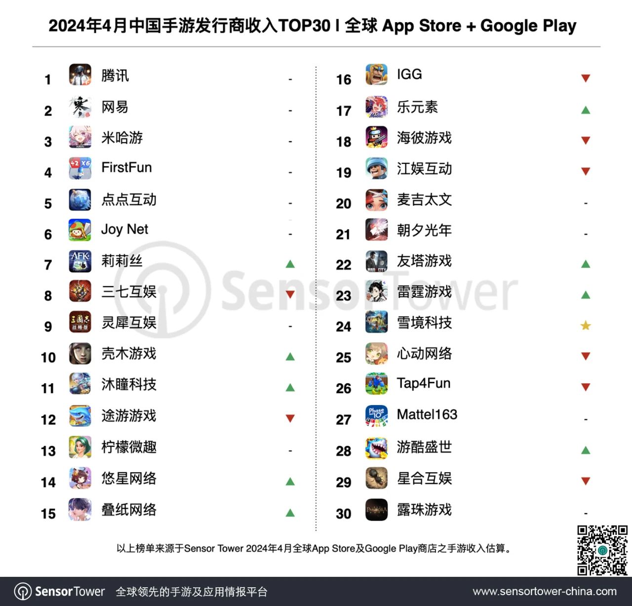 得益于《问道》手游8周年活动的敞开,以及在国内商场推出新游《航海王:愿望指针》,4月雷霆游戏移动端收入环比增加16%,排名行进3位至第23名。
