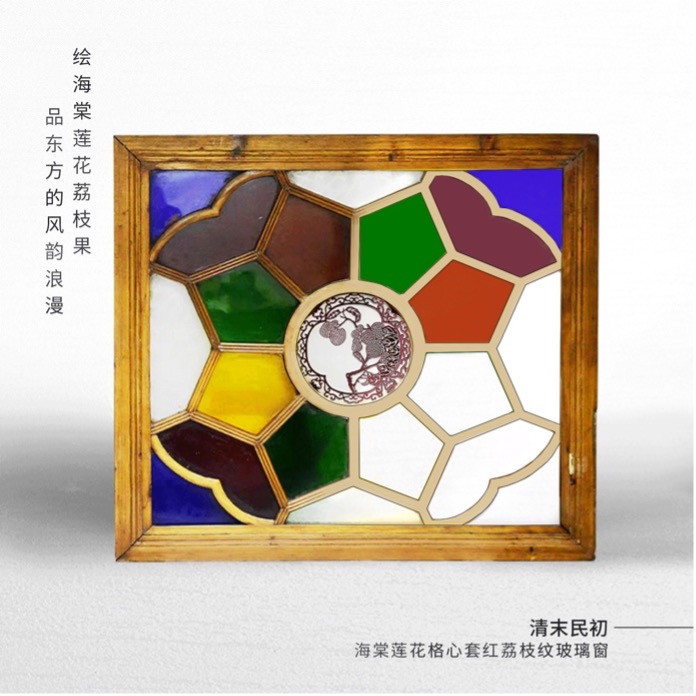 海棠莲花格心套红荔枝纹玻璃窗(清末民初)