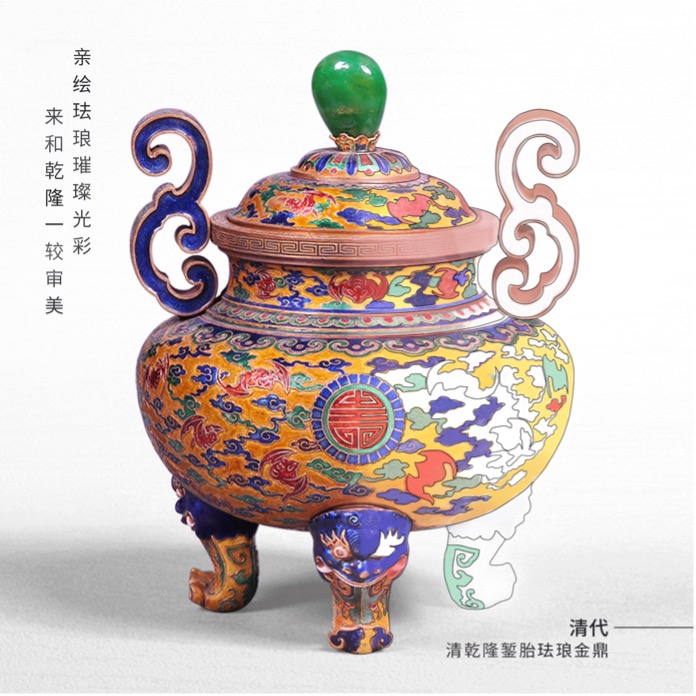 此鼎代表了广作搪瓷的最高水准。清代錾胎搪瓷工艺的制造中心是广州。其时,清宫内造办处的搪瓷匠人大多由粤海关选入,称为“南匠”。