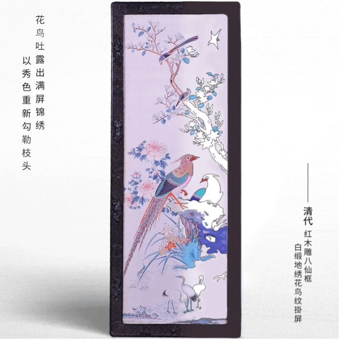 红木雕八仙框白缎地绣花鸟纹掛屏-第4幅(清代)